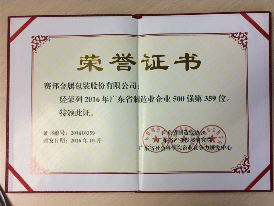 近年來,賽邦金屬包裝股份有限公司堅(jiān)持以誠信為本,質(zhì)量第一,用戶滿意為宗旨;以金屬印刷、氣霧罐、工藝罐、飲料罐等多個模塊開展業(yè)務(wù);不斷開拓進(jìn)取,多元化業(yè)務(wù)蓬勃發(fā)展。今年憑借在氣罐罐、金屬印刷等細(xì)分市場的絕對優(yōu)勢,助推企業(yè)的實(shí)力、能力和品牌影響力不斷提升,企業(yè)營業(yè)收入、經(jīng)濟(jì)效益也不斷攀升。 201 6 年獲得 201 6 年度廣東省制造企業(yè) 500 強(qiáng),是集團(tuán)綜合實(shí)力的體現(xiàn)。賽邦金屬包裝股份有限公司將繼續(xù)強(qiáng)化創(chuàng)新驅(qū)動,推動業(yè)務(wù)升級,切實(shí)提高發(fā)展的質(zhì)量和效益,并以回報社會為己任,為民造福,為廣東經(jīng)濟(jì)發(fā)展作出新的貢獻(xiàn)。