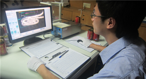 質(zhì)檢員正在用罐二重卷封投影儀檢測卷封質(zhì)量
